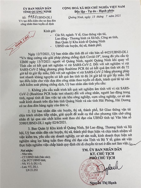 Ngày 13-7, Ủy ban nhân dân tỉnh Quảng Ninh đã ban hành văn bản số 4481/UBND-DL1 về việc tạo điều kiện cho xe đưa đón công nhân theo tuyến cố định.