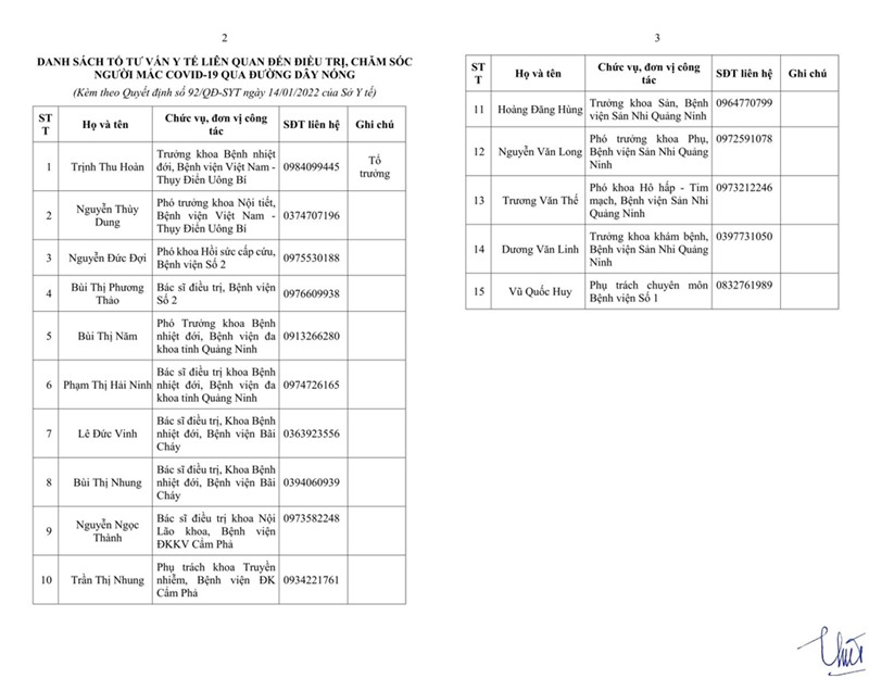 Sở Y tế Quảng Ninh vừa có quyết định thành lập Tổ tư vấn y tế liên quan đến điều trị, chăm sóc người mắc Covid-19 (F0) qua đường dây nóng. Theo đó, Tổ tư vấn có 15 bác sĩ, thuộc Bệnh viện Việt Nam-Thụy Điển Uông Bí, Bệnh viện số 1 (TTYT Móng Cái), Bệnh viện số 2 (Bệnh viện Phổi Quảng Ninh), Bệnh viện Đa khoa tỉnh, Bệnh viện Bãi Cháy, Bệnh viện Đa khoa khu vực Cẩm Phả, Bệnh viện Sản Nhi.