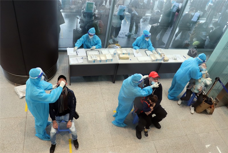 Lực lượng chức năng thực hiện lấy mẫu test nhanh cho hành khách từ Đức nhập cảnh vào Việt Nam qua Sân bay quốc tế Vân Đồn, tháng 1/2022.