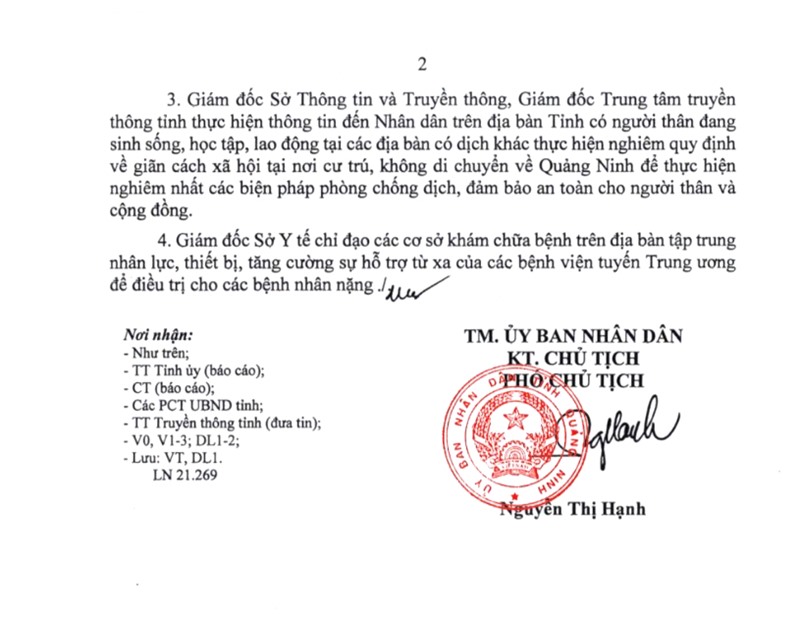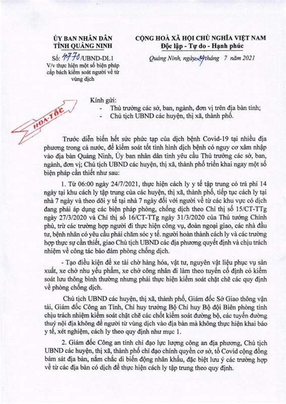 Ngày 24-7, Ủy ban nhân dân tỉnh Quảng Ninh ban hành văn bản số 4770/UBND-DL1 về việc thực hiện một số biện pháp cấp bách kiểm soát người về từ vùng dịch