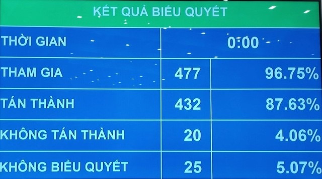 Kết quả biểu quyết bằng hình thức điện tử cho thấy, có 432 ĐBQH tham gia biểu quyết tán thành (chiếm 87,63%), Quốc hội chính thức thông qua Luật Đất đai (sửa đổi).