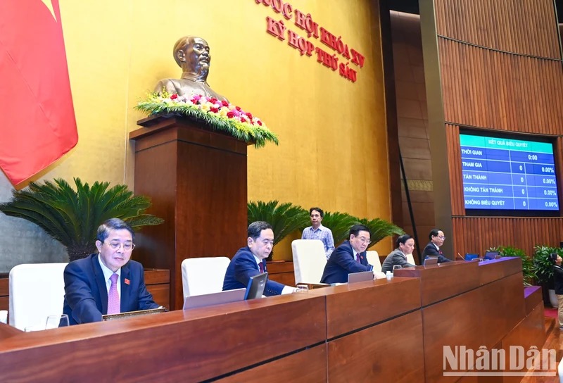 Chủ tịch Quốc hội Vương Đình Huệ và các Phó Chủ tịch Quốc hội biểu quyết thông qua Nghị quyết về giám sát chuyên đề “Việc triển khai thực hiện các Nghị quyết của Quốc hội về các Chương trình mục tiêu quốc gia về xây dựng nông thôn mới giai đoạn 2021-2025, giảm nghèo bền vững giai đoạn 2021-2025, phát triển kinh tế-xã hội vùng đồng bào dân tộc thiểu số và miền núi giai đoạn 2021-2030”. (Ảnh: DUY LINH)