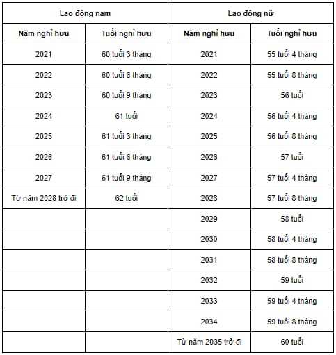 Kể từ năm 2021, tuổi nghỉ hưu của người lao động trong điều kiện lao động bình thường là đủ 60 tuổi 3 tháng đối với lao động nam và đủ 55 tuổi 4 tháng đối với lao động nữ. Sau đó, cứ mỗi năm tăng thêm 3 tháng đối với lao động nam và 04 tháng đối với lao động nữ.(**)