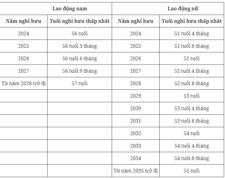 Vào năm 2024 độ tuổi nghỉ hưu của người lao động nam sẽ là 61 tuổi, lao động nữ sẽ là 56 tuổi 4 tháng.