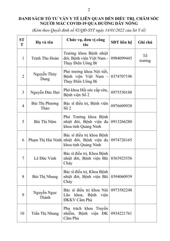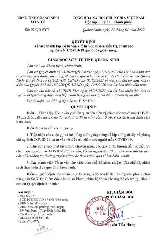 Quyết định về việc thành lập Tổ tư vấn y tế liên quan đến điều trị, chăm sóc người mắc COVID-19 qua đường dây nóng.