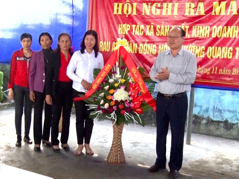 Lãnh đạo Hội Nông dân tỉnh tặng hoa chúc mừng HTX sản xuất, kinh doanh rau sạch Đồng Nối.