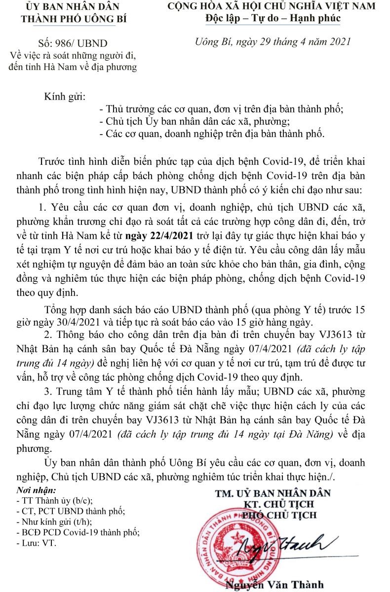 Ngày 29-4, UBND thành phố Uông Bí ban hành văn bản số 986/UBND về việc rà soát những người đi, đến tỉnh Hà Nam về địa phương.