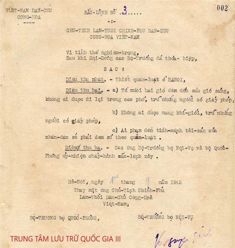Sắc lệnh số 3 ngày 1/9/1945 của Chủ tịch nước Việt Nam Dân chủ Cộng hoà về việc thiết quân luật ở Hà Nội. Nguồn: Trung tâm Lưu trữ quốc gia III, phông Phủ Thủ tướng, mục lục 1, hồ sơ 01, tờ 02.