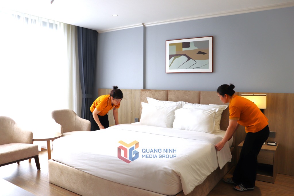 Nhân viên khách sạn tại TP Móng Cái vệ sinh phòng, sẵn sàng đón khách du lịch.