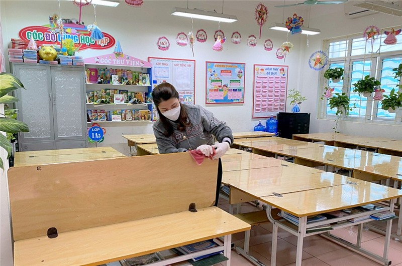 Giáo viên Trường Tiểu học Hạ Long tổng vệ sinh, khử khuẩn phòng học, lớp học, sẵn sàng đón học sinh quay trở lại trường sau kỳ nghỉ Tết.