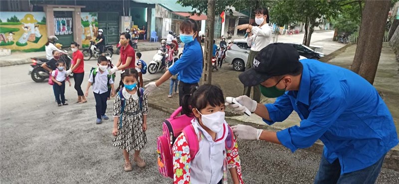 Tại Trường TH Lý Thường Kiệt, lực lượng Đoàn viên thanh niên phối hợp cùng nhà trường phân luồng, kiểm tra y tế để đảm bảo an toàn cho học sinh đến trường.