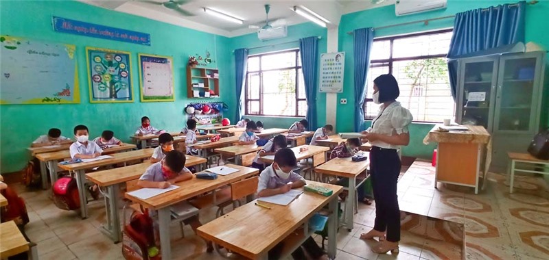 Tại mỗi lớp học, Trường Tiểu học Lý Thường Kiệt đều bố trí giãn khoảng cách ngồi học giữa các học sinh và áp dụng những biện pháp phòng dịch nghiêm túc.