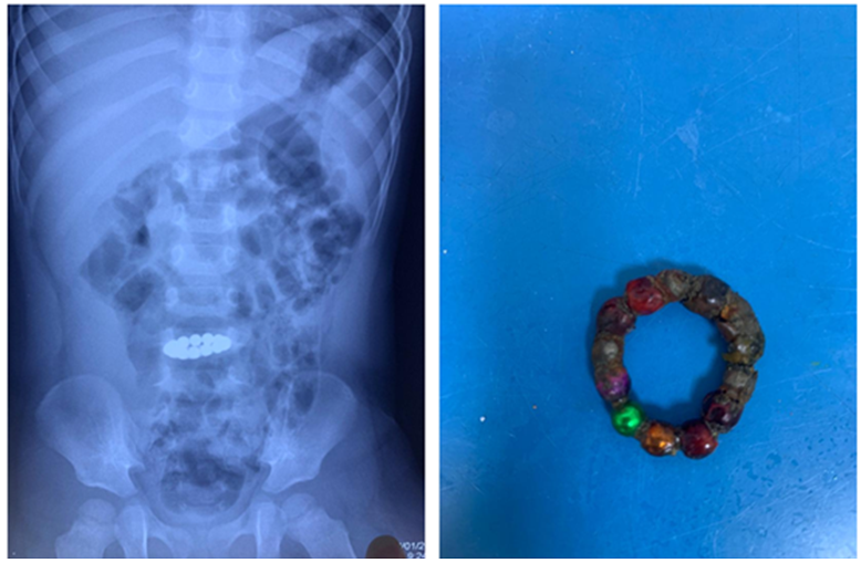 Theo đó, bệnh nhi nhập viện trong tình trạng bứt rứt, khó chịu, đau bụng, ói. Khai thác bệnh sử ghi nhận một tháng trước khi nhập viện, bé chơi ở nhà rồi nuốt các viên bi nam châm màu của một người chị.