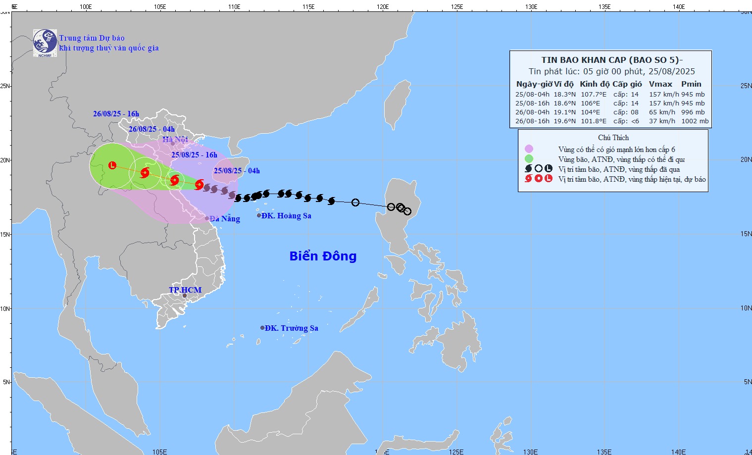 Bản đồ dự báo quỹ đạo và cường độ bão số 5 phát lúc 5 giờ ngày 25.8. Nguồn: Trung tâm Dự báo Khí tượng Thủy văn Quốc gia