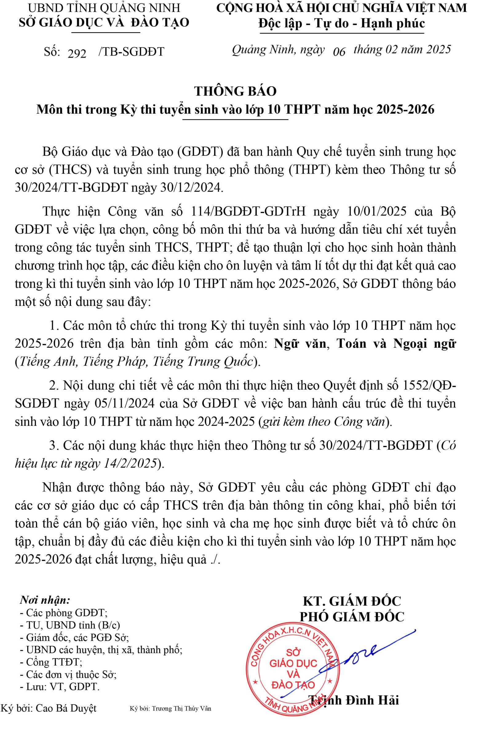 Sở Giáo dục và Đào tạo tỉnh Quảng Ninh thông báo môn thi trong kỳ thi tuyển sinh vào lớp 10 THPT năm 2025-2026