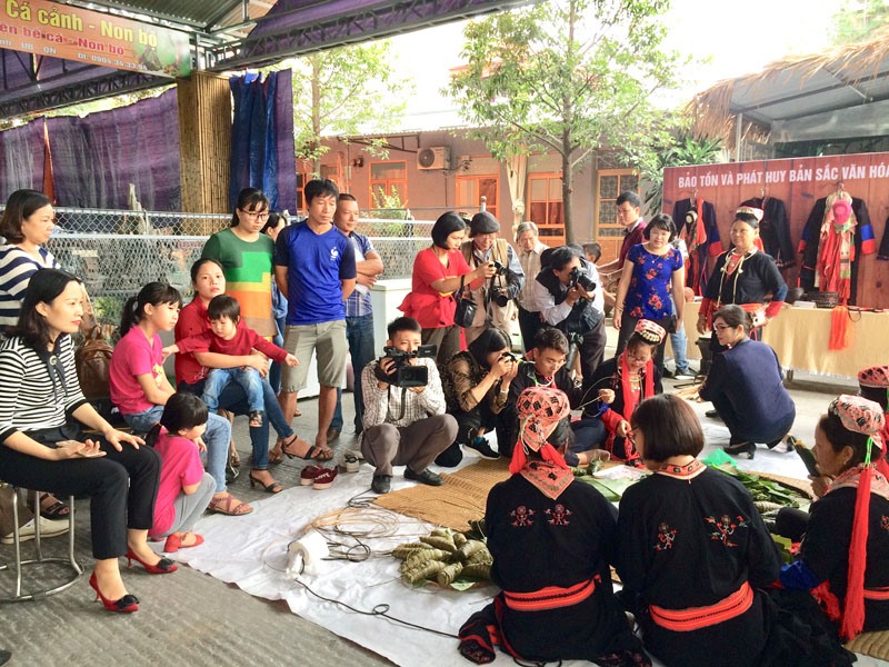 Đông đảo người dân và du khách tham gia gói bánh chưng gù, đặc sản của người Dao Thanh y.