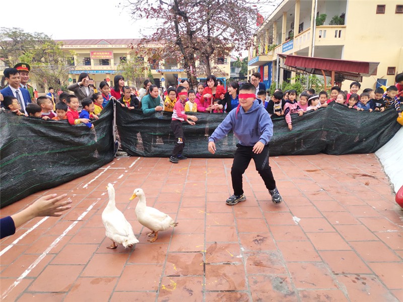 Trò chơi bịt mắt bắt vịt được đông đảo học sinh tham gia cổ vũ.