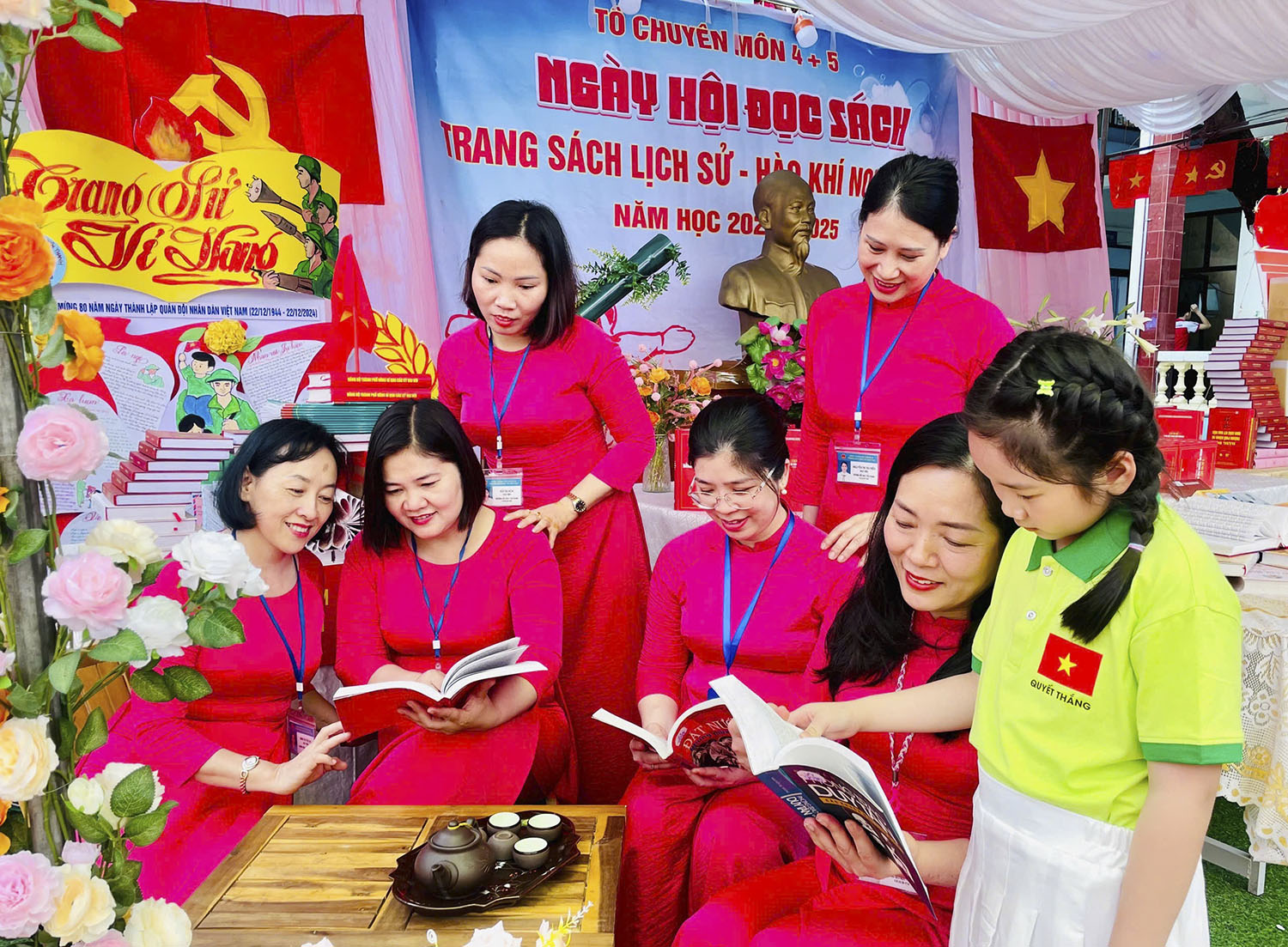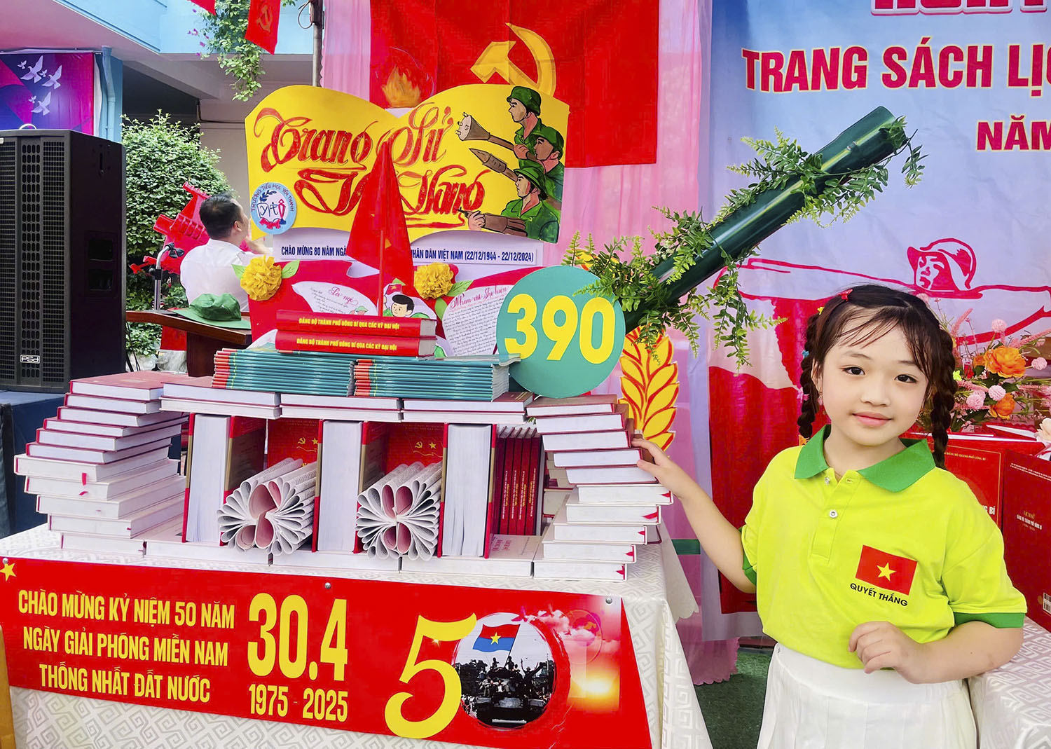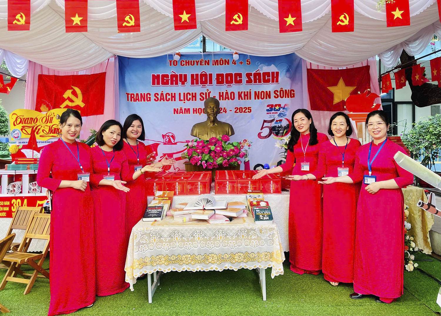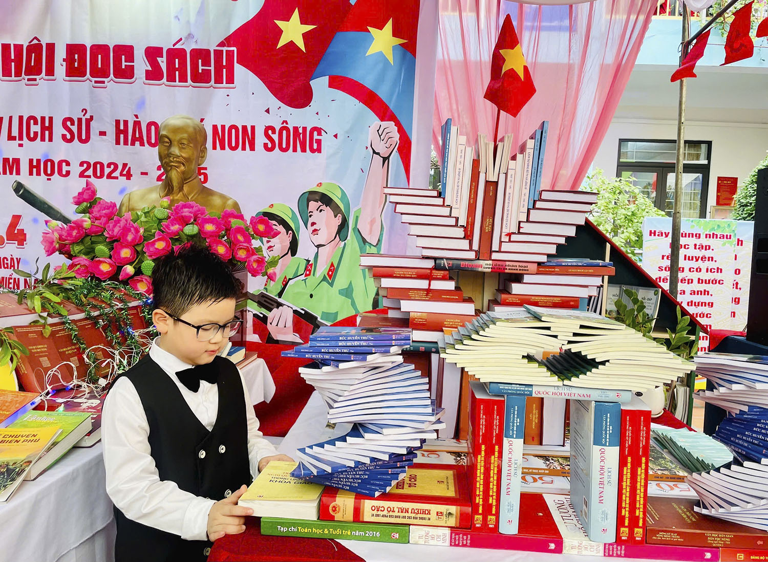 Một điểm nhấn của Ngày hội là hai gian trưng bày sách nghệ thuật trong khuôn viên nhà trường. Những cuốn sách, tài liệu gắn liền với tiến trình của cuộc cách mạng giải phóng dân tộc, thống nhất đất nước, lịch sử xây dựng và phát triển địa phương được giáo viên, học sinh nhà trường trưng bày, xếp nghệ thuật hình số sự kiện Ngày giải phóng miền Nam thống nhất đất nước 30/4. Tham quan không gian trưng bày, em Đỗ Thảo Nguyên, học sinh lớp 5A3 bày tỏ cảm xúc: “Em rất thích đọc sách. Những cuốn sách được trưng bày tại đây rất hay, giúp em hiểu hơn về ý nghĩa, vai trò và giá trị to lớn của thắng lợi mà quân và dân ta đã phải trải qua bao gian khổ, hy sinh để bảo vệ hoà bình, chủ quyền đất nước. Được tham quan, em càng yêu quý sách hơn, thêm yêu mến, tự hào về lịch sử”.