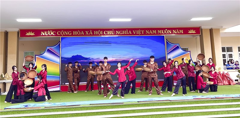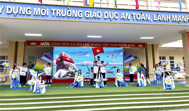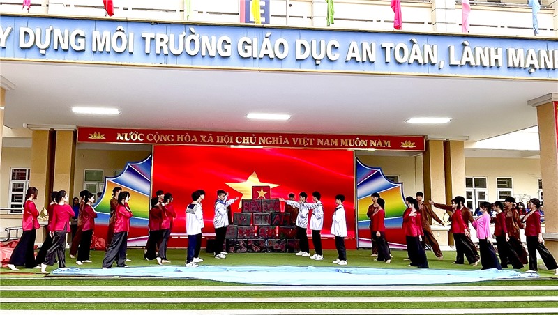 Điểm nhấn trong tiết sinh hoạt dưới cờ hướng tới kỷ niệm 79 năm ngày thành lập Quân Đội Nhân Dân Việt Nam và 34 năm Ngày hội Quốc phòng toàn dân là chương trình hoạt động ngoài giờ lên lớp chủ đề tháng 12 “Thanh niên với biển đảo, quê hương, đất nước” do Chi đoàn 10A9 và Chi đoàn 10A10 thực hiện. Trong chương trình, đại biểu, thầy cô giáo và các em học sinh đã được thưởng thức chương trình văn nghệ đặc sắc do các em học sinh nhà trường biểu diễn với những màn hát múa chủ đề biển đảo quê hương. Đặc biệt hoạt cảnh “Bám biển” của chi đoàn 10A10 với sự đầu tư dàn dựng công phu, hấp dẫn, ca ngợi tinh thần kiên trung của các chiến sĩ hải quân, những người dân vùng biển đang hăng say lao động sản xuất, anh dũng sống, chiến đấu bảo vệ chủ quyền biển đảo của quê hương đã mang đến nhiều cảm xúc cho người xem. Tiếp đó, học sinh nhà trường đã tham gia giao lưu trả lời câu hỏi với nội dung những kiến thức về biển đảo. Thông qua đó góp phần giáo dục về lòng tự hào, tinh thần yêu nước cho học sinh nhà trường.
