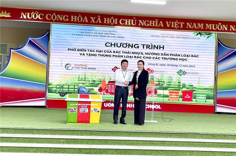 Quỹ Bảo vệ môi trường và phát triển đất tỉnh Quảng Ninh đã trao tặng nhà trường một số thùng rác phân loại rác thải.
