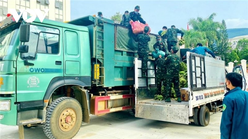 Cán bộ, chiến sĩ Trung đoàn 754 (Bộ CHQS tỉnh Sơn La) hỗ trợ vận chuyển lương thực, thực phẩm đến từng tiểu khu, tổ bản ở huyện Phù Yên.