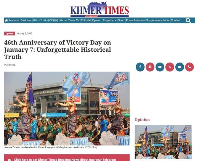 Báo “Khmer Times” phiên bản tiếng Anh online đăng tải bài viết với tiêu đề “Kỷ niệm 46 năm Ngày Chiến thắng 7/1: Sự thật lịch sử không thể lãng quên” (ảnh chụp màn hình), phát ngày 3/1/2025. Ảnh: TTXVN phát