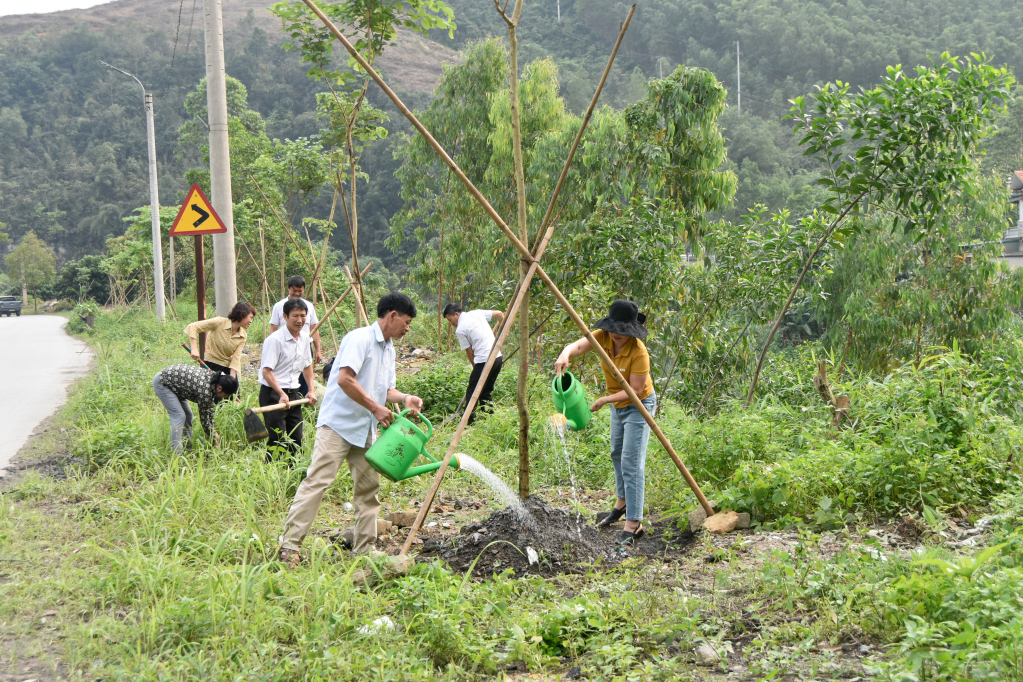 Cán bộ, nhân dân phường Vàng Danh (TP Uông Bí) tham gia trồng, chăm sóc hàng hoa ban tại tuyến đường chào mừng đại hội MTTQ các cấp.