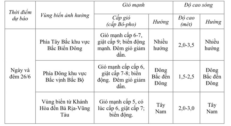 Ngoài ra, ngày và đêm 26/6, ở vùng biển phía đông khu vực Vịnh Bắc Bộ, vùng biển phía tây bắc khu vực bắc Biển Đông, khu vực giữa và nam Biển Đông (bao gồm vùng biển quần đảo Trường Sa), vùng biển từ Bình Thuận đến Cà Mau, Cà Mau đến Kiên Giang và vịnh Thái Lan có mưa rào và dông. Trong mưa dông có khả năng xảy ra lốc xoáy, gió giật mạnh cấp 6-7.