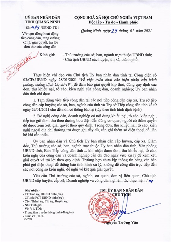 Ngày 29-1, đồng chí Chủ tịch UBND tỉnh đã ký ban hành Công văn số 499/UBND-TD1 về việc tạm dừng hoạt động tiếp công dân, tăng cường xử lý, giải quyết, trả lời đơn thư của công dân.