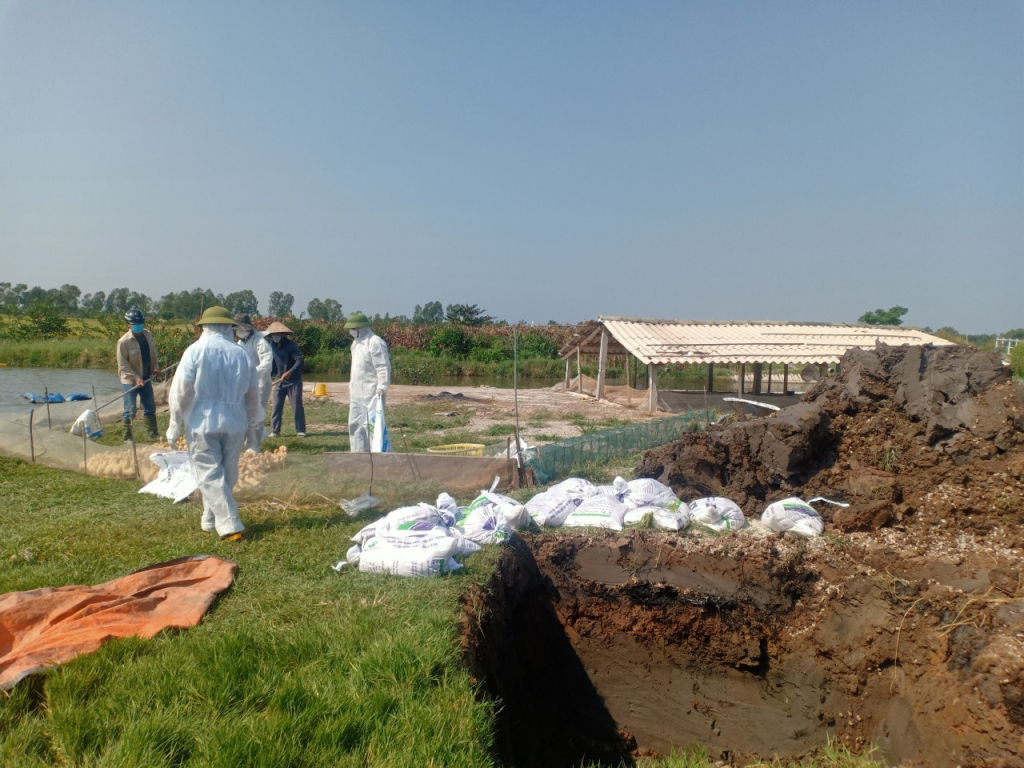 Lực lượng chức năng tiêu hủy đàn vịt bị nhiễm cúm A/H5N1 của gia đình ông Hoàng Văn Cường, thôn 1, xã Tiền Phong, TX Quảng Yên.