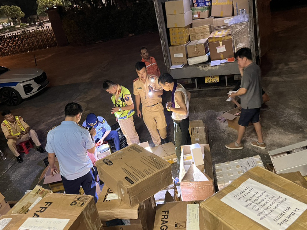 Lực lượng QLTT tỉnh và Đội CSGT số 2 kiểm tra xe ô tô biển kiểm soát 14C-262.06, thu giữ nhiều hàng hóa không rõ nguồn gốc.