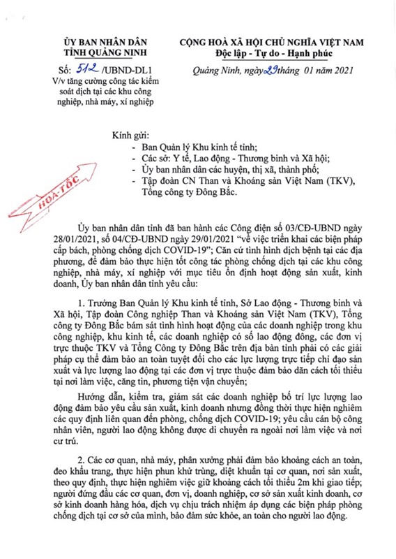Ngày 29-1, đồng chí Chủ tịch UBND tỉnh Quảng Ninh đã ký ban hàng công văn số 512/UBND-DL1 về việc tăng cường công tác kiểm soát dịch tại các khu công nghiệp, nhà máy, xí nghiệp