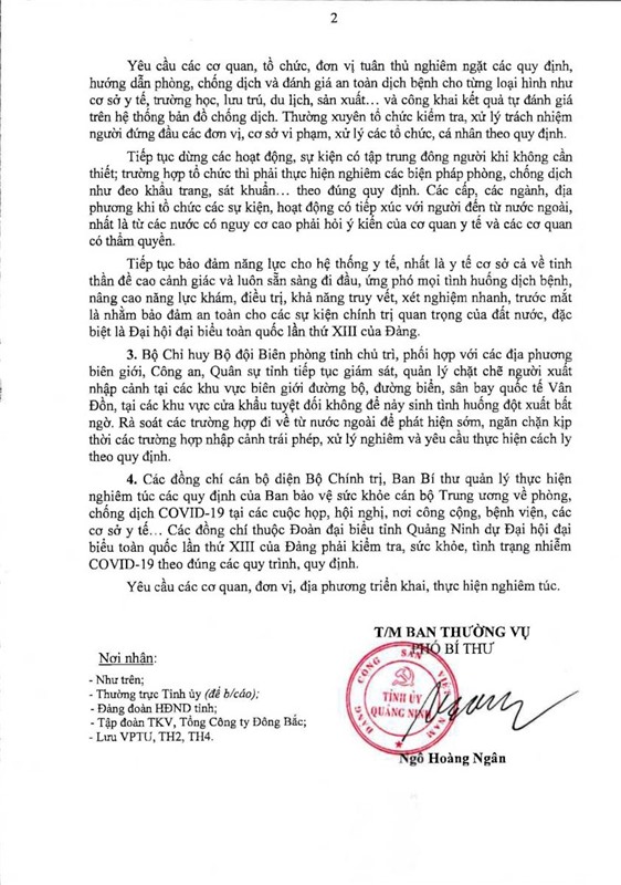 Ngày 9-12, Tỉnh ủy Quảng Ninh ban hành Công văn số 132-CV/TU V/v tăng cường công tác phòng chống dịch COVID-19 trên địa bàn tỉnh.