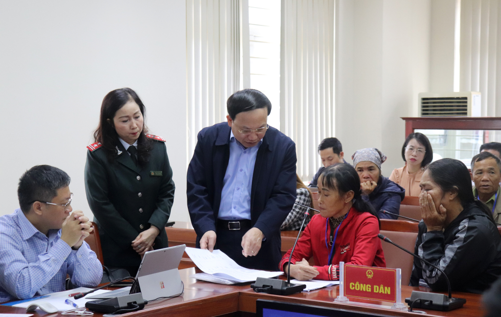 Đồng chí Bí thư Tỉnh ủy, Chủ tịch HĐND tỉnh trao đổi với các công dân trong buổi tiếp công dân định kỳ tháng 11/2023. Ảnh: Thu Chung