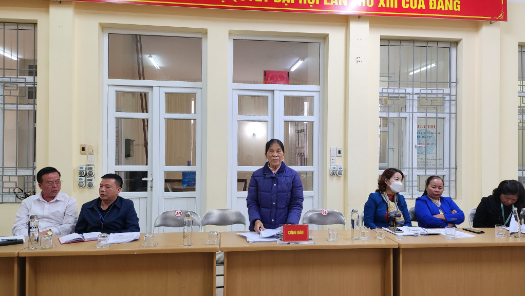 Bà Hà Thị Nhung, phường Đại Yên, TP Hạ Long trình bày ý kiến tại buổi làm việc, gặp gỡ, đối thoại, công khai, thông tin kết quả giải quyết đối với các nội dung KNTC, phản ánh, kiến nghị của công dân do UBND TP Hạ Long tổ chức vào ngày 12/1/2024. Ảnh: Thanh Hoa