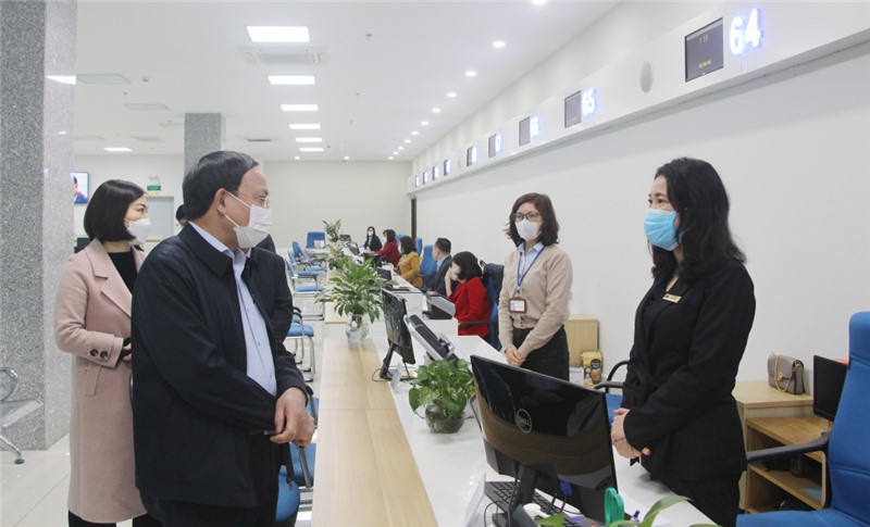 Các đồng chí lãnh đạo tỉnh kiểm tra công vụ tại Trung tâm Phục vụ hành chính công tỉnh, tháng 2/2022.