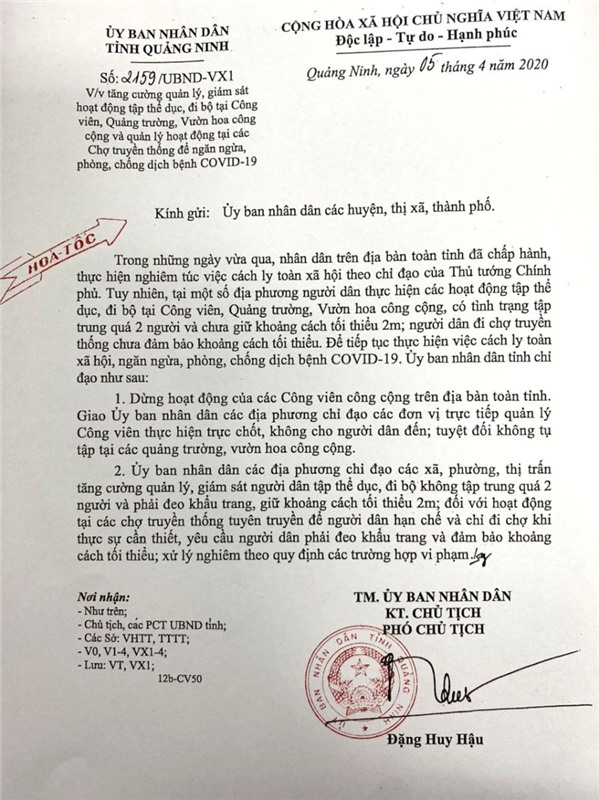 Ngày 5/4, UBND tỉnh có công văn gửi UBND các huyện, thị xã thành phố về việc Tăng cường quản lý, giám sát hoạt động tập thể dục, đi bộ tại Công viên, Quảng trường, Vườn hoa công cộng và quản lý hoạt động Chợ truyền thống để ngăn ngừa, phòng, chống dịch bệnh COVID-19