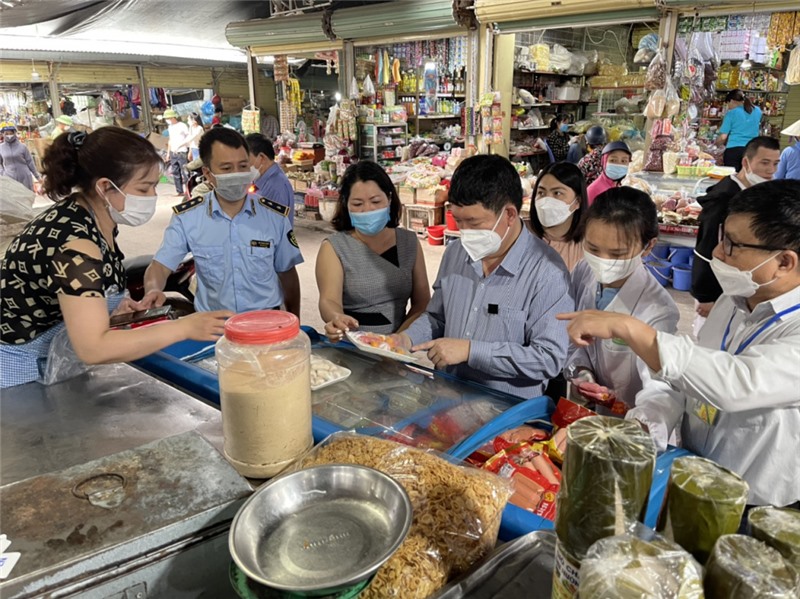 Đoàn liên ngành của tỉnh kiểm tra việc kinh doanh các sản phẩm thực phẩm tại chợ ASEAN (TP Móng Cái) tháng 5/2023. Ảnh: Minh Đức