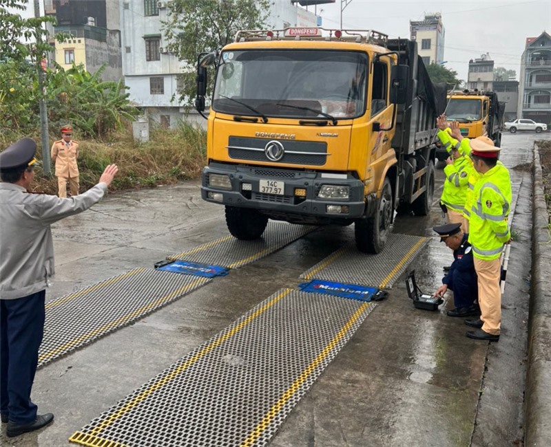 Lực lượng chức năng tiến hành cân kiểm tra tải trọng phương tiện.