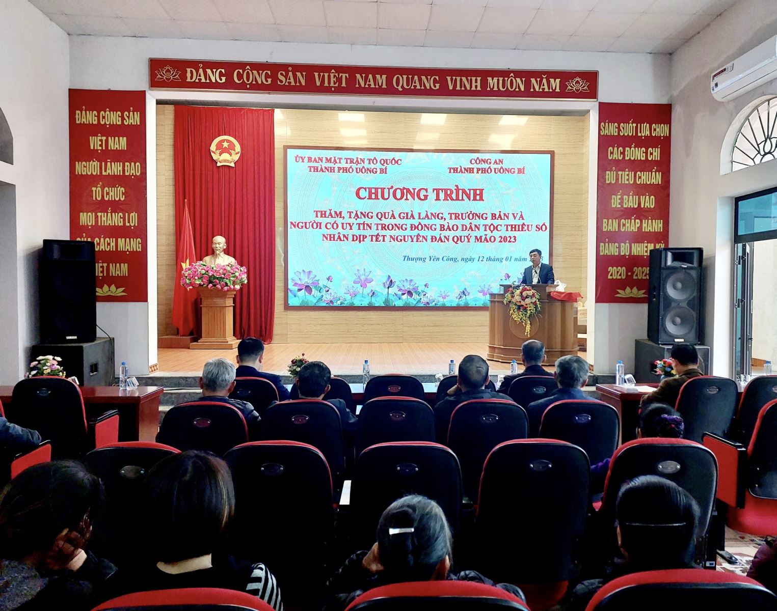 Chiều ngày 12/1, Đoàn công tác do đồng chí Đào Ngọc Sơn, UVBTV, Trưởng Ban Dân vận Thành ủy, Chủ tịch MTTQ thành phố làm trưởng đoàn đã tổ chức chương trình gặp mặt, chúc Tết các già làng, trưởng bản, người có uy tín trong đồng bào dân tộc thiểu số tại phường Vàng Danh và xã Thượng Yên Công nhân dịp Tết nguyên đán Quý Mão 2023. Cùng đi có đại diện lãnh đạo Công an thành phố Uông Bí cùng lãnh đạo các địa phương.