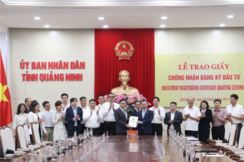 Lãnh đạo UBND tỉnh trao quyết định cho nhà đầu tư nước ngoài.