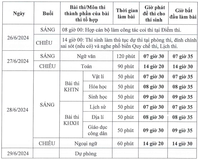 Thí sinh làm thủ tục dự thi vào ngày 26/6, làm bài thi Toán và Ngữ văn hôm 27/6. Ngày 28/6, thí sinh thi Ngoại ngữ và một trong 2 bài thi tổ hợp là Khoa học tự nhiên và Khoa học xã hội.