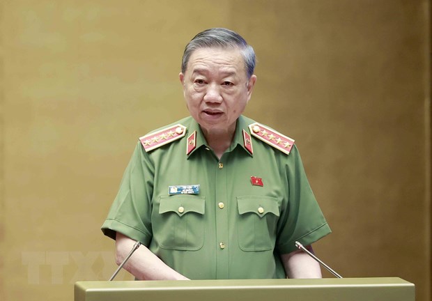 Bộ trưởng Bộ Công an Tô Lâm trình bày Tờ trình về dự án Luật Lực lượng tham gia bảo vệ an ninh, trật tự ở cơ sở. (Ảnh: TTXVN)