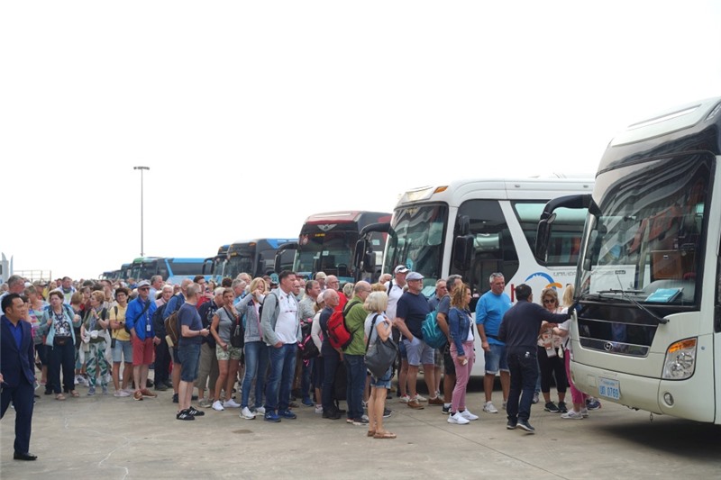 Khách du lịch tàu biển theo đoàn tham quan TP Hạ Long.