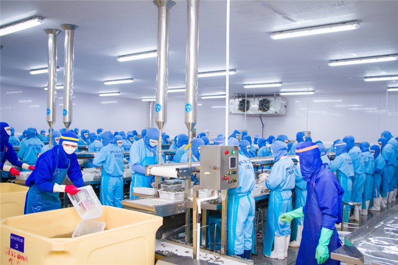 Công nhân Công ty CP Thủy sản BNA (CCN Nam Sơn, huyện Ba Chẽ) sơ chế tôm phục vụ xuất khẩu.