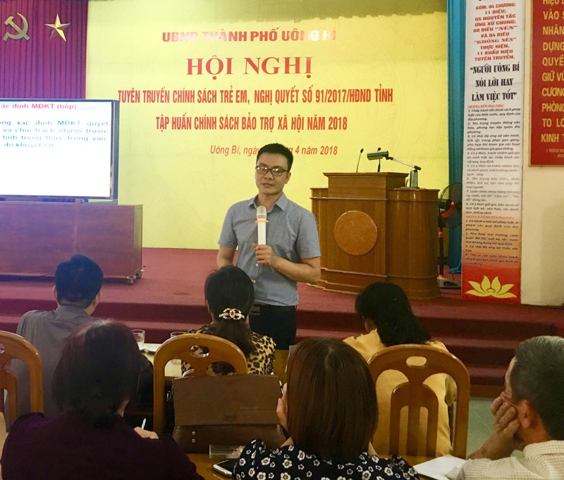 Chiều ngày 24-4, tại phường Yên Thanh, UBND thành phố tổ chức tập huấn chính sách bảo trợ xã hội năm 2018 cho lãnh đạo, công chức Lao động TB&XH thành phố, các xã, phường; trưởng, phó thôn, khu, cộng tác viên công tác xã hội của 101 thôn, khu.