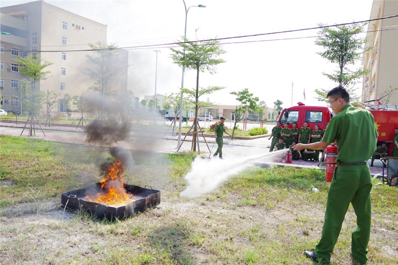 Cũng trong chương trình, các học viên được thực hành sử dụng bình bột, bình khí CO2 chữa cháy khay xăng dầu; xử lý sự cố rò rỉ khí gas từ bình gây cháy; triển khai lăng, vòi phun nước chữa cháy, dập tắt một tình huống cháy giả định.
