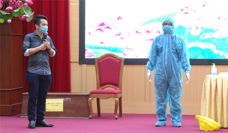 Cán bộ trung tâm y tế thành phố hướng dẫn sử dụng quần áo bảo hộ phòng chống dịch.