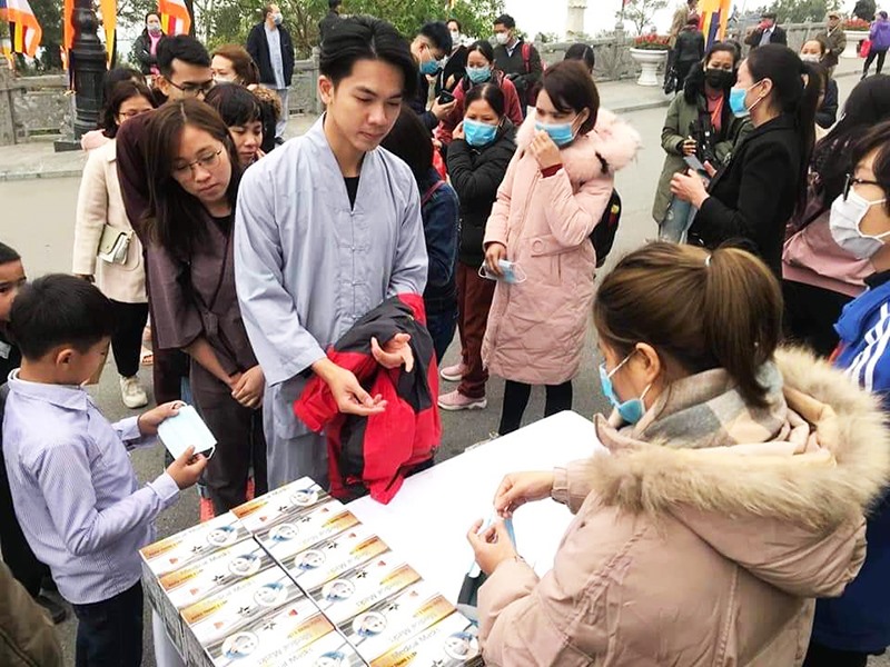 Hội phật tử chùa Ba Vàng phát khẩu trang cho du khách.