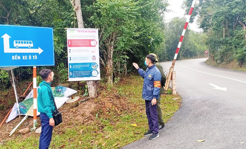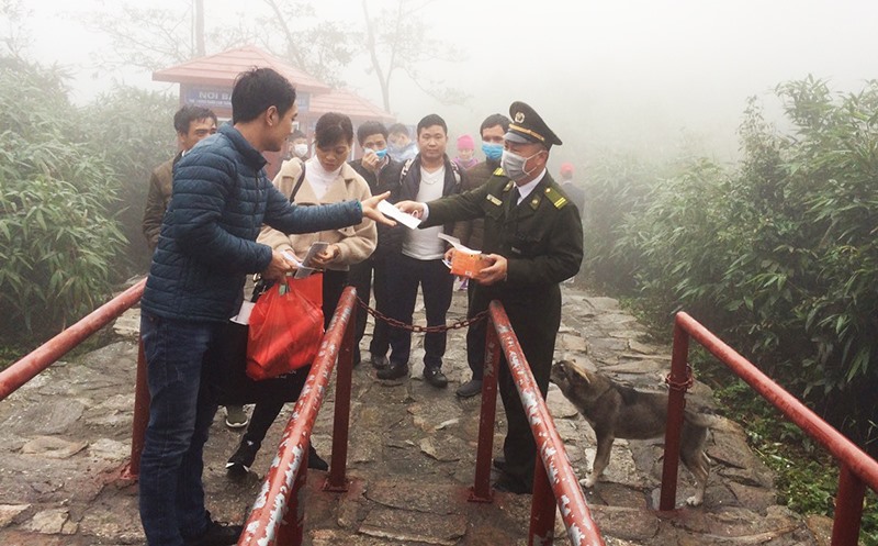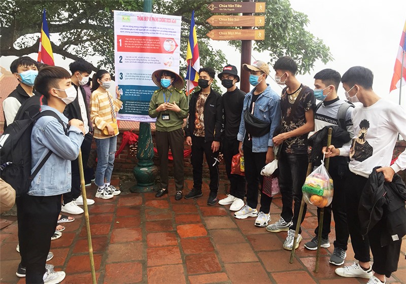 Nhân viên Ban Quản lý Di tích và Rừng Quốc gia Yên Tử tuyên truyền, hướng dẫn du khách tại Yên Tử phòng tránh nhiễm vi rút nCoV.